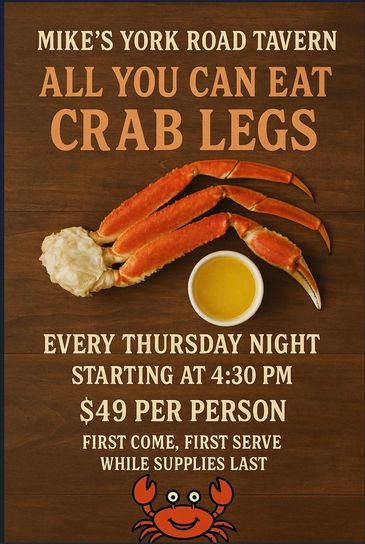 Mike's York Road Tavern will be hosting all you can eat crab legs, every Thursday starting at 4:30PM